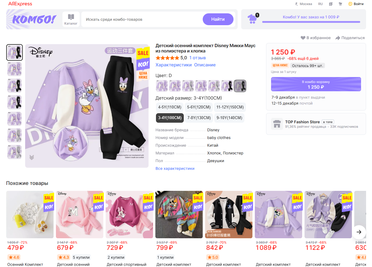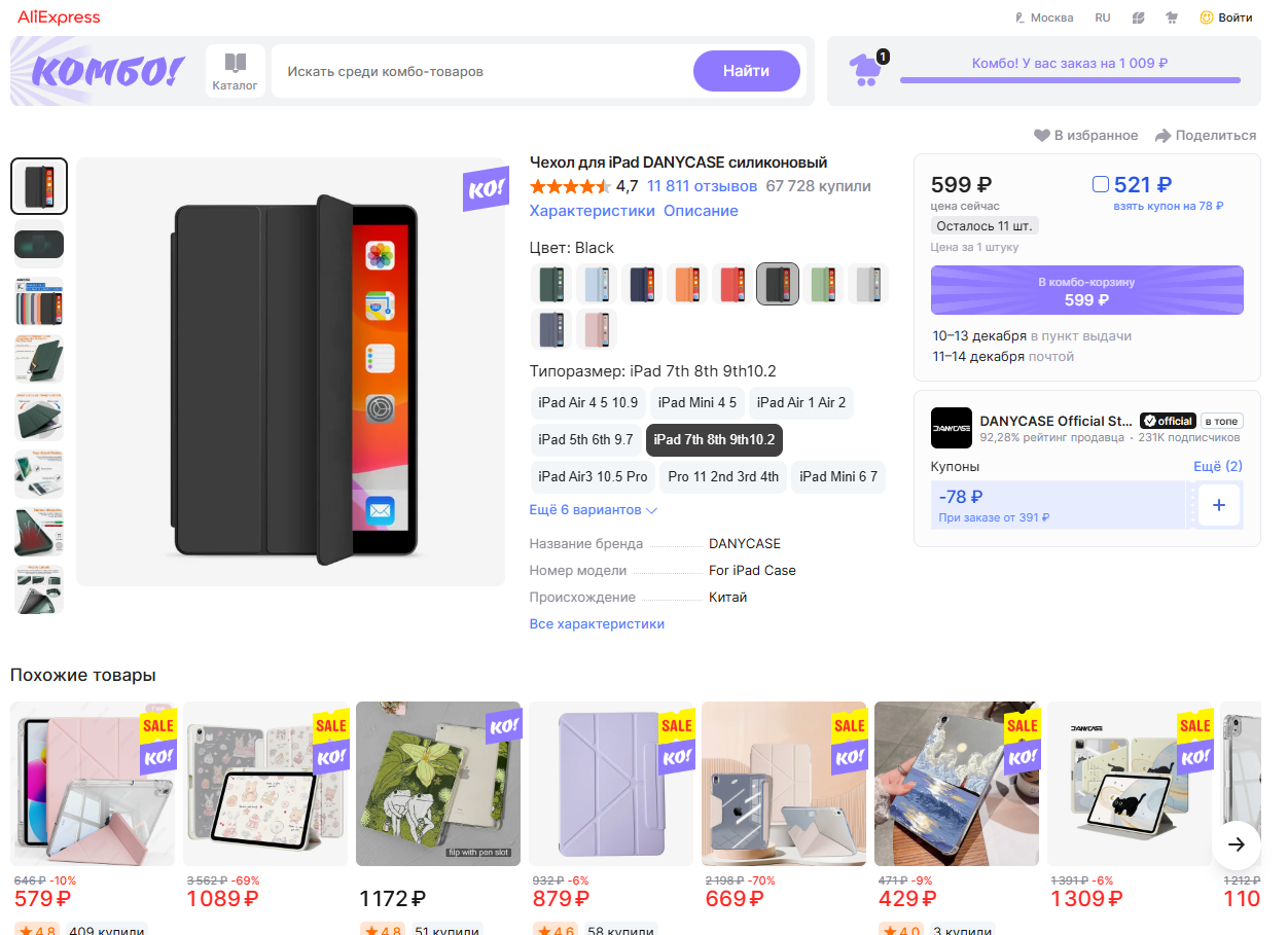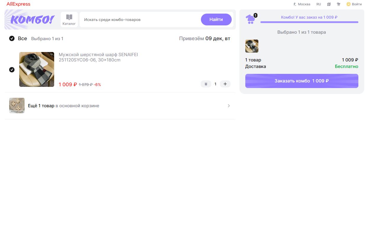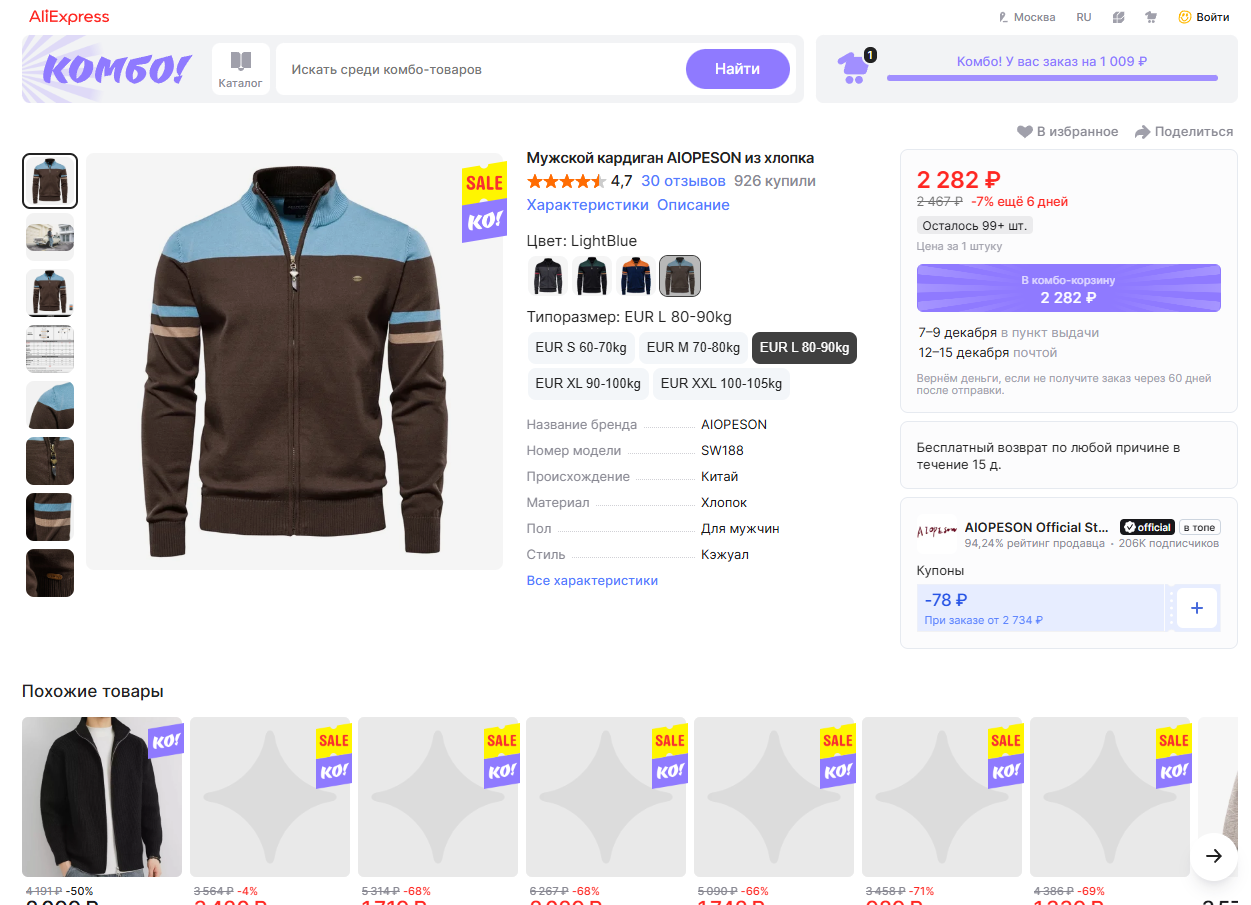 Суть комбо сводится к тому, что вы объединяете в один заказ несколько товаров от разных продавцов и получаете их вместе в одной посылке. Торговая площадка так обеспечивает себе более высокий средний чек и экономит на логистике, а вам достается большой дисконт и бесплатная доставка.