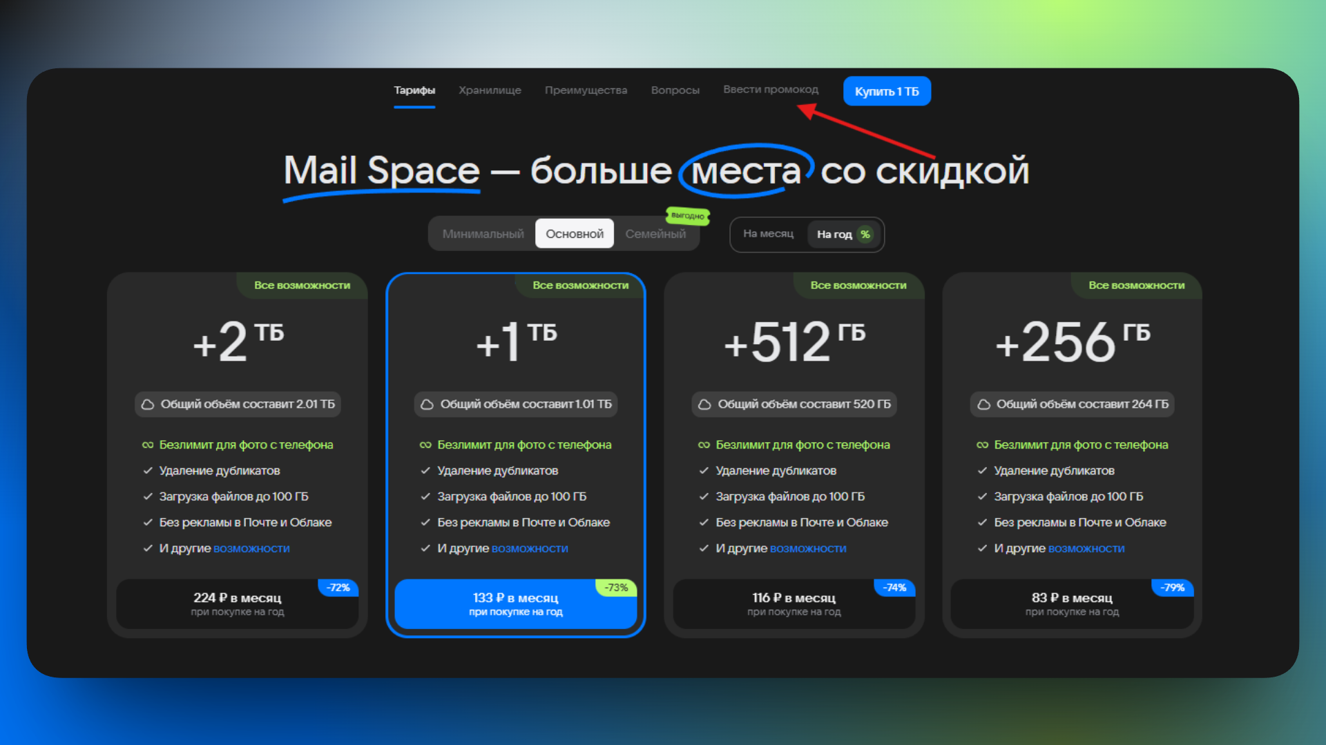 Чтобы применить промокод Mail Space при оформлении подписки на официальном сайте сервиса:
